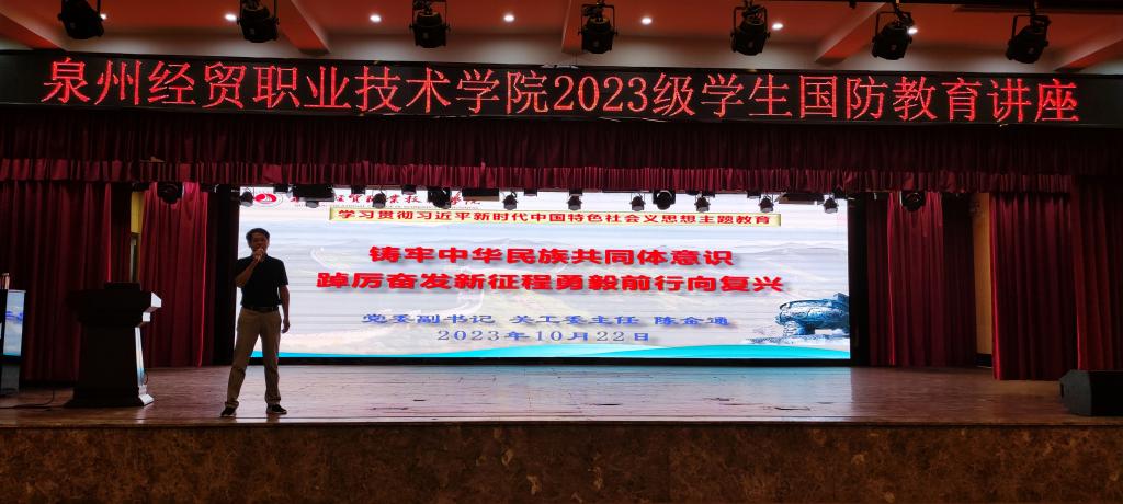 10月22日晚,学院党委副书记陈金通在大礼堂为2023级新生带来了一场精彩的国防教育专题讲座。会审系、慈山分院军训教官以及2023级辅导员和1039名新生聆听了讲座。