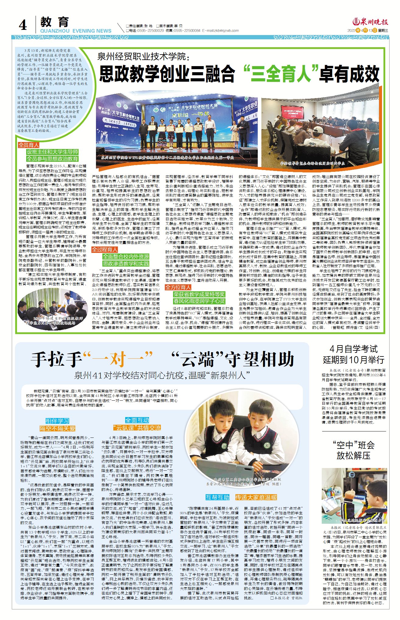 这是泉州经贸职业技术学院管理系“三全育人”(全员、全过程、全方位育人)的一个缩影。该系紧紧围绕思想政治工作,积极探索思政教育与专业教学有机融合、思政教育与创新创业实践有机融合,构建三者融会贯通的“三全育人”教育教学格局,成为福建省首批高校“三全育人”综合改革试点院系,于今年2月通过了福建省委教育工委的验收。