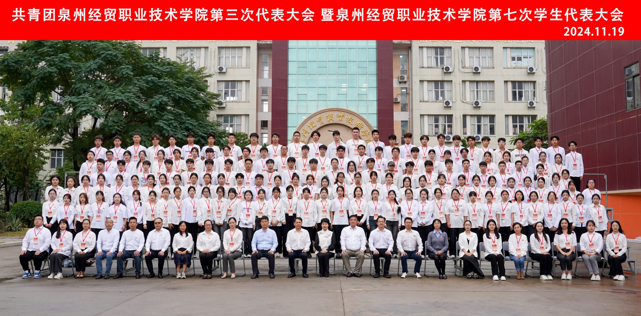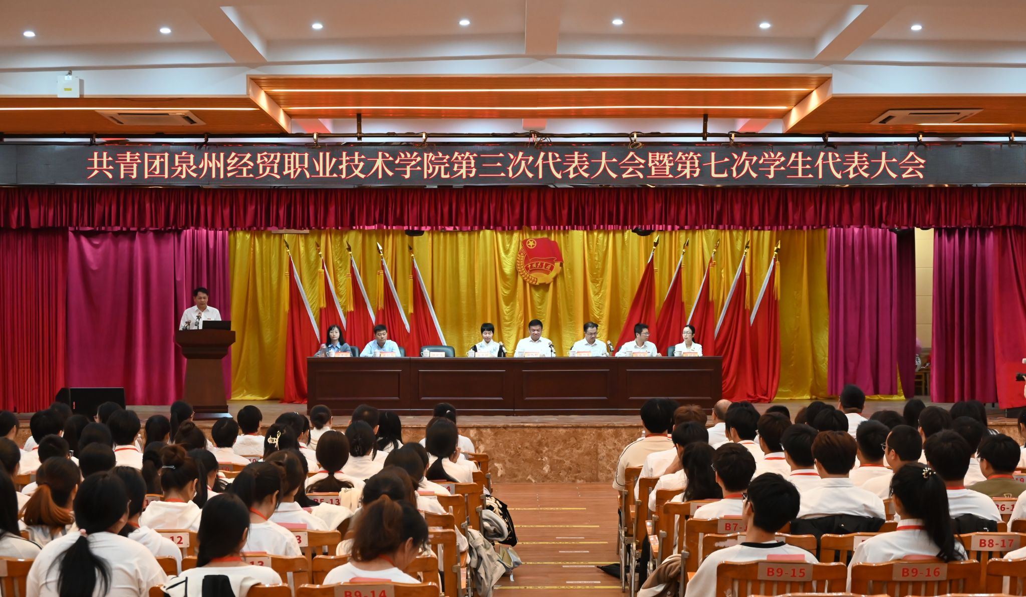 11月19日下午,院团委在学院大礼堂召开共青团泉州经贸职业技术学院第三次代表大会暨泉州经贸职业技术学院第七次学生代表大会。团市委书记张井丽、学院党委书记廖伏树、学院党委副书记陈金通、团市委学少部部长陈为藩,学院党工部、学生处、宣传部负责人及各二级院系学生工作负责人出席开幕式。117名团员代表和125名学生代表参加大会。