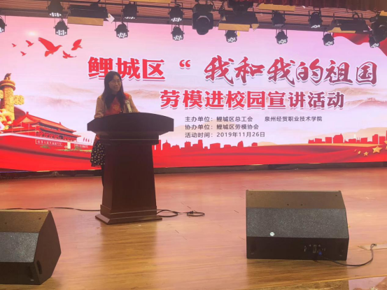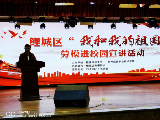 为了扎实开展“不忘初心、牢记使命”主题教育,大力弘扬以爱国主义为核心的伟大民族精神和新时代劳模精神、劳动精神、工匠精神,进一步发挥先进模范在推进高质量发展落实赶超中的示范引领作用,11月26日下午,学院与鲤城区总工会在学院大礼堂共同举行“我和我的祖国”劳模进校园宣讲活动。学院副院长花文苍、鲤城区总工会副主席陈建新以及学院师生代表参加活动,宣讲活动由继续教育部主任邵建忠主持。