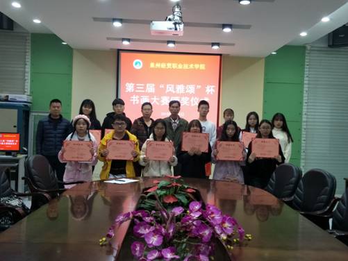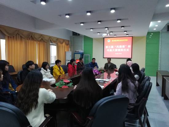 1月4日下午,第三届“风雅颂”杯书画大赛颁奖仪式在行政楼三楼会议室举行。图书馆馆长高坤育、副馆长郑巧红,综合办主任蓝开强、读者服务部老师、获奖同学及部分学生代表参加了颁奖仪式。因工作及路途遥远等其他原因,社会组获奖作者不进行现场颁奖。