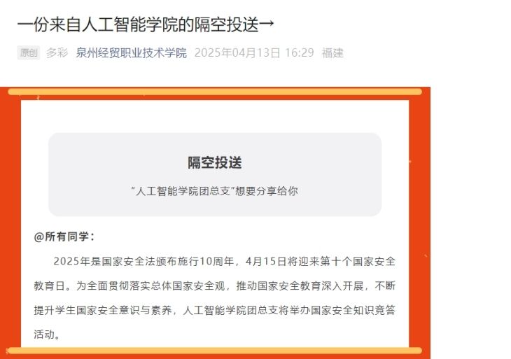 为全面贯彻落实总体国家安全观,推动国家安全教育在校园内深入开展,切实提升学生的国家安全意识与素养,人工智能学院团总支精心策划并组织了一系列丰富多彩、形式多样的国家安全教育主题活动。