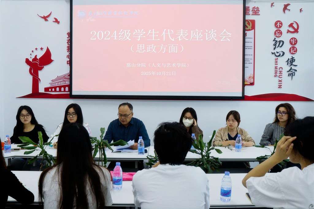 为切实了解学生学业发展与生活状况,广泛听取意见建议,进一步提升育人质量与学生服务水平,慈山分院(人文与艺术学院)于10月中下旬陆续组织召开2023级、2024级、2025级学生代表系列座谈会。会议聚焦教育教学、学风建设、生活服务与职业发展等重点议题,学院相关负责人、教师代表及各年级学生代表参与。