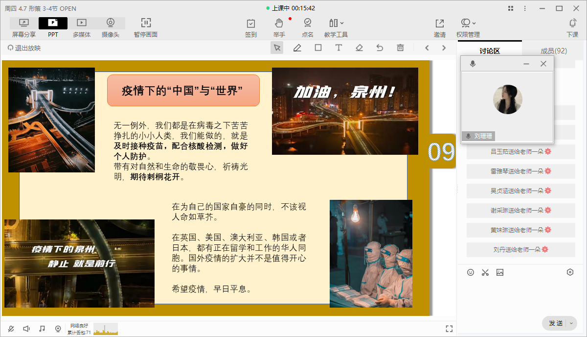 战“疫”期间,思政部全体教师,坚守岗位,讲好思政课,唱响主旋律、弘扬正能量,把思政课的育人优势转化为抗疫力量,引导学生积极配合防控工作、缓解压力、坚定抗疫信心,让学生深刻感受到疫情大考下社会主义制度的巨大优势,进一步发挥思政课是立德树人的关键课程的作用。