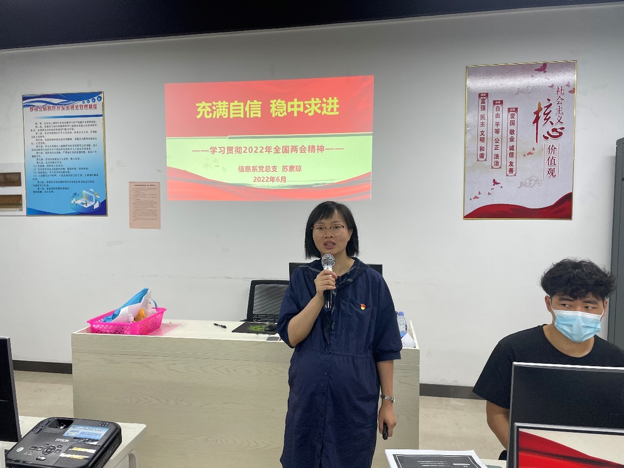 信息系党总支副书记苏素琼以“充满自信稳中求进——学习贯彻2022年全国两会精神”为主题,带领同学们深入学习了习近平总书记在2022年全国两会的讲话精神,了解成绩,看准问题,做好2022年工作的具体政策举措。同时,对同学们提出了几点希望:一是要不断加强政治理论学习,可以采用线上线下相结合的方式,通过学习强国等官方渠道进行学习;二是积极参与院系举办的各项比赛和志愿活动,充分发挥在同学中的先锋模范作用,不断提高自身综合能力;三是要肩负起新时代的职责和使命,以实现中华民族伟大复兴为目标,以时不我待的姿态,努力学习新知识,掌握新技能,立身为社会服务。