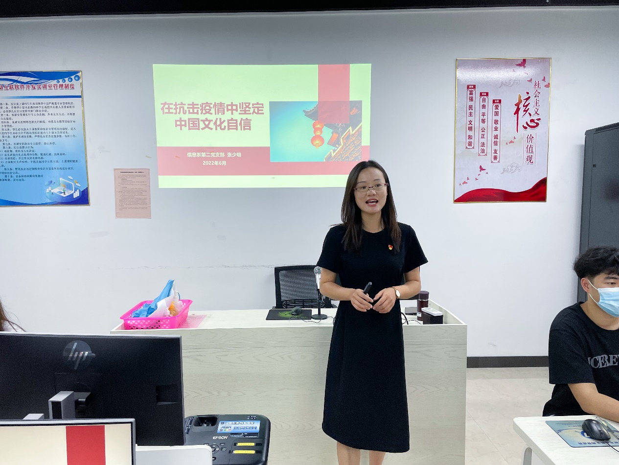 信息系第二党支部书记张少明以“在抗击疫情中坚定中国文化自信”为主题,为同学们进一步讲述了新冠疫情发生以来,全国人民群众在党的统一领导下战疫抗疫,以及党员干部无私奉献事迹。解读背后的中国文化精神内涵,勉励同学们学习中华优秀文化,将精神价值凝聚成前行力量,继续奋斗、勇敢前行,争取更美好更辉煌的未来。