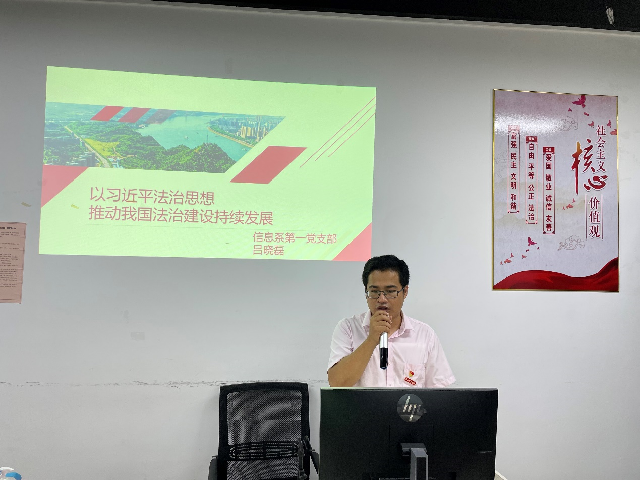 信息系第一党支部书记吕晓磊“以习近平法治思想,推动我国法治建设持续健康发展”为主题,结合社会热点,深入分析了习近平法治思想的重大意义及时代内涵。