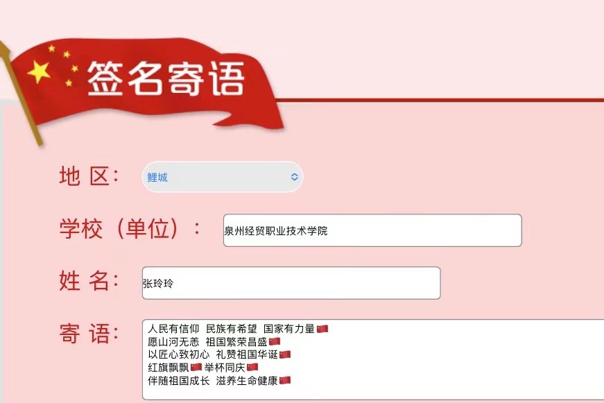 10月1日,信息系团总支组织各班同学参与“向国旗敬礼”网上签名寄语活动以及“向祖国告白”海报制作活动。同学们用文字抒发热爱祖国、祝福祖国的情感,发挥自己的专业特色,抒发了自己对祖国的美好祝福,表达为实现民族复兴中国梦而努力奋斗的远大志向,向祖国献礼。