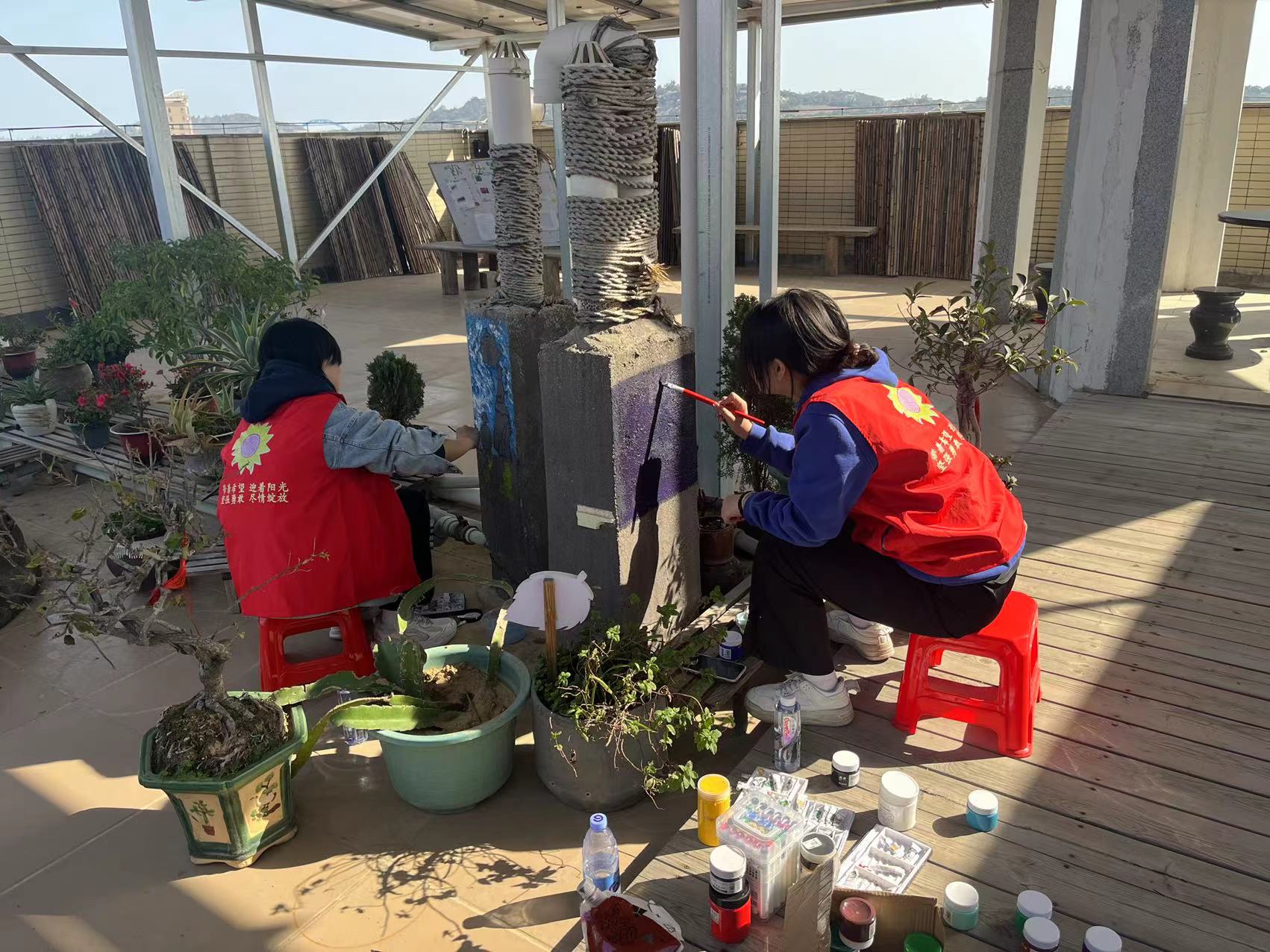 挥洒青春活力,彩绘扮靓社区。负责彩绘的志愿者发挥自身的专业优势,对白奇村幸福院7楼进行公共空间改造,他们精心设计图案,认真细致地在水泥柱上、花盆上勾勒出精美的图案,让幸福院变得更加具有魅力和吸引力。