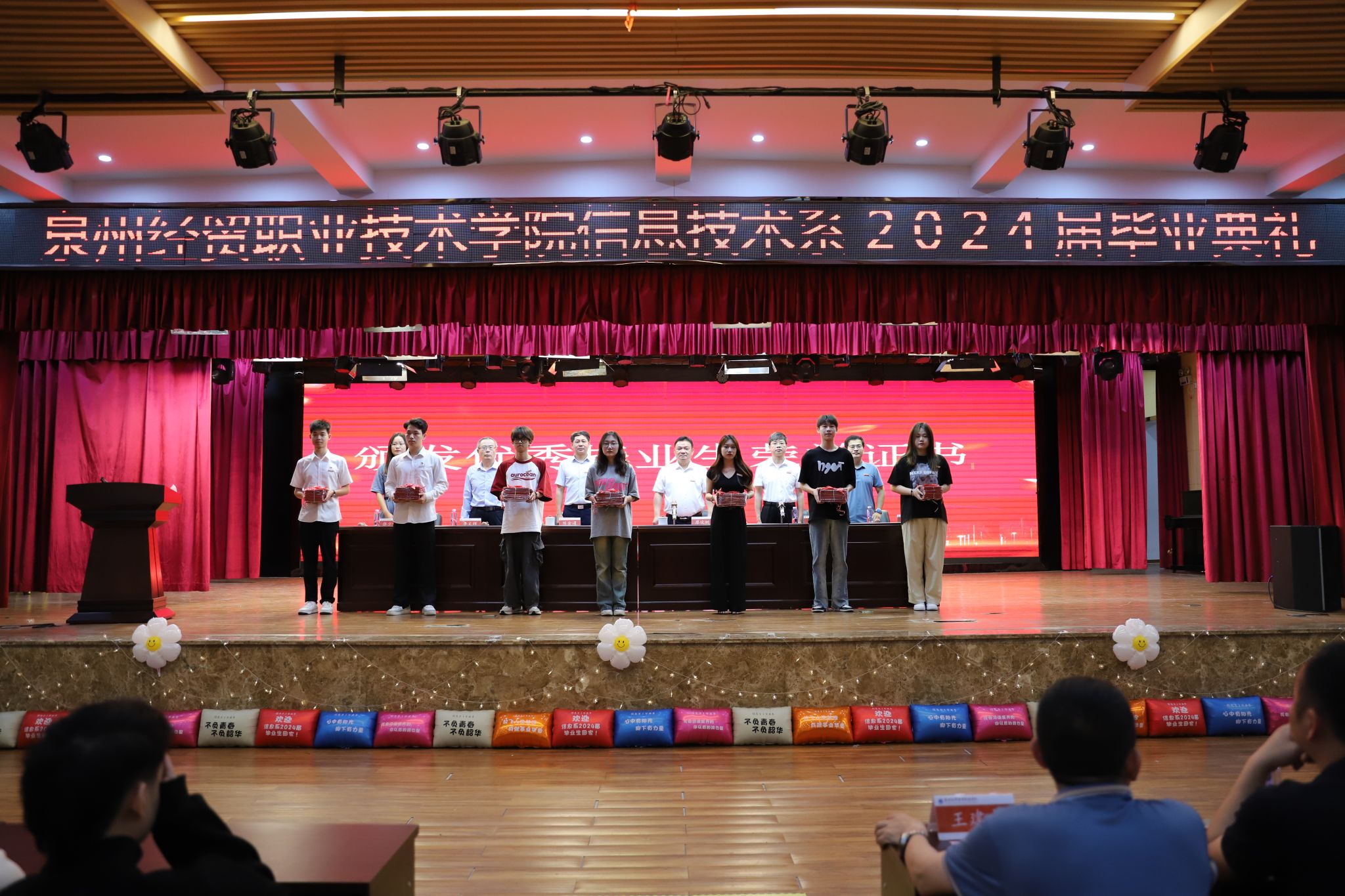 信息系党总支书记李文辉依次宣读2022-2023学年国家奖学金、高校国家励志奖学金获奖学生名单,以及学院《关于表彰2024届优秀毕业生的决定》和2024届校友联络员名单。与会领导为奖学金获得者、优秀毕业生、2024届毕业生,以及被聘为校友联络员的学生颁发证书。