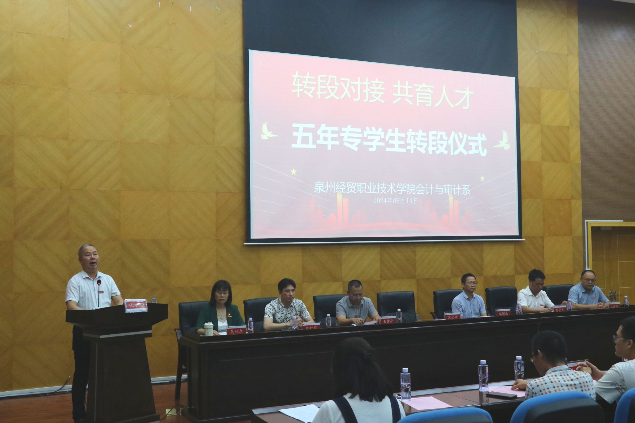 为贯彻落实五年一贯制高等职业教育人才培养方案要求,6月14日,学院在学术报告厅举行2021级五年制“会计信息管理”专业中职转高职(转段)启航仪式。学院党委委员、副院长沈永希,石狮鹏山工贸学校正校级干部郑国成、安溪陈利职业中专学校副校长王建平出席仪式。学院招就处、会审系等部门负责人,联办中职学校教师代表和21级五年制高职全体学生参加本次活动。
